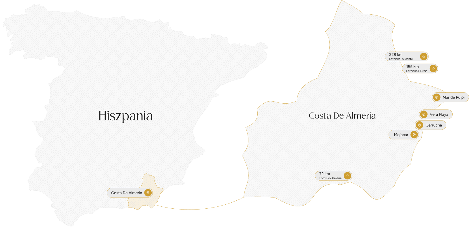 Costa Almeria oferuje także doskonałe warunki do aktywnego stylu życia: światowej klasy pola golfowe, padel, tenis, sporty wodne, szerokie plaże oraz wyjątkowy klimat pustynny w pobliżu Tabernas. To region, który wciąż dynamicznie się rozwija, a ceny nieruchomości w Hiszpanii na tym odcinku wybrzeża mają duży potencjał wzrostu w najbliższych latach. Dla wielu osób Costa Almeria staje się nie tylko miejscem na wakacje, ale przestrzenią do życia i inwestowania. To połączenie słońca, morza, natury i hiszpańskiego stylu życia, które sprawia, że coraz więcej kupujących wybiera właśnie tę część Andaluzji na swoje apartamenty i wille w Hiszpanii.